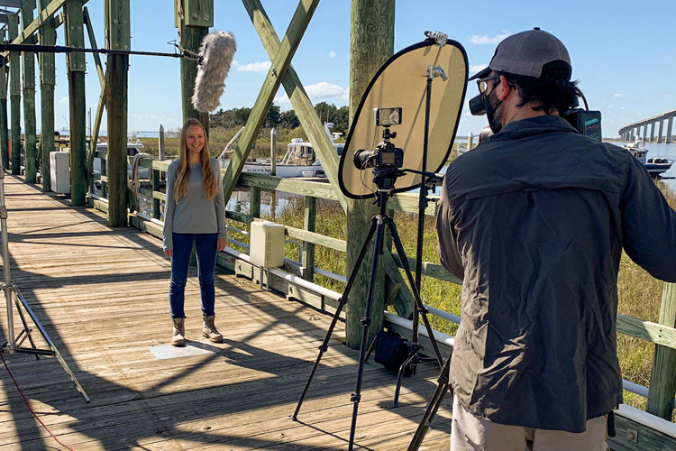 Videographer Matt Hanner with Motion House Media films Meghan Angelina with the Georgia Department of Natural Resources Coastal Resources Division as part of the Faces of Resiliency video series.