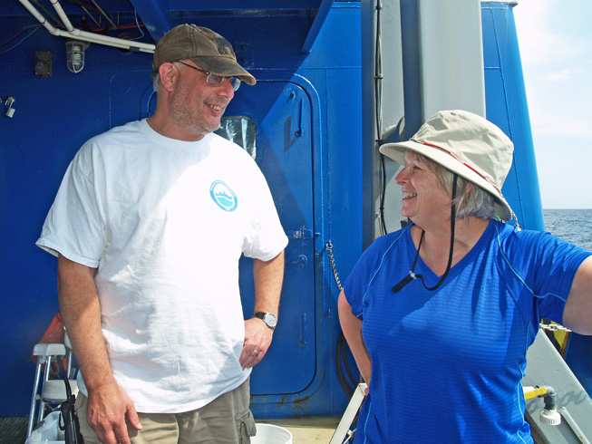 Waters were calm for the voyage out to Gray’s Reef National Marine Sanctuary on the R/V Savannah under the command of Capt. John Bichy, marine superintendent at UGA Skidaway Institute. With extensive assistance from the R/V Savannah crew, the teachers conducted water quality tests at three separate points in the ocean. Meanwhile, the ship’s crew pulled a trawl net through the ocean at midwater depth and brought in many interesting fish, a large pile of Georgia shrimp and a handful of sharks, including a hammerhead and a small Atlantic sharpnose shark. During the trip, the teachers were delighted when they were treated to lessons by professor Marc Frischer of Skidaway Institute on black gill in shrimp and on pelagic tunicates called doliolids. While in the sanctuary, the crew deployed an underwater camera to allow the teachers to see the reef and its sea creatures in real time, without getting wet.